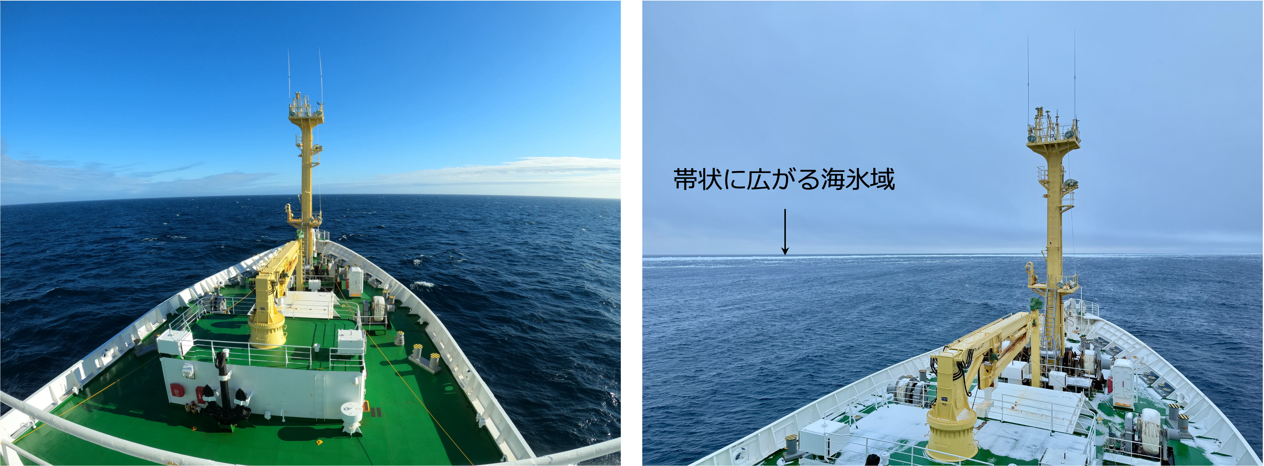 海域別の海氷分布を見ると、グリーンランド東側からバレンツ海・カラ海北側やボーフォート海では2010年代平均より縮小した一方、ラプテフ海から東シベリア海では2010年代平均を上回る海氷域が広がっていました(図2)。特に、東シベリア海では北寄りの風の影響で沿岸に海氷が残りやすい状況となっていたことが一因で(注5)、北極海の海氷域面積縮小を抑えるように働きました。このような例年と異なる今年の海氷分布の特徴は、現場観測からも確認されています。ちょうど今年の最小面積を記録した9月7日には、北極海観測のために航海中の海洋地球研究船「みらい」(注6)が海氷のないチュクチ海を航行中でした(図3左)。その後、9月19日にチュクチ海からさらに北へと航行していた「みらい」の先には、帯状に広がる海氷域が観測されており(図3右)、同じ9月でも海域によって海氷分布が大きく異なることを示しています。