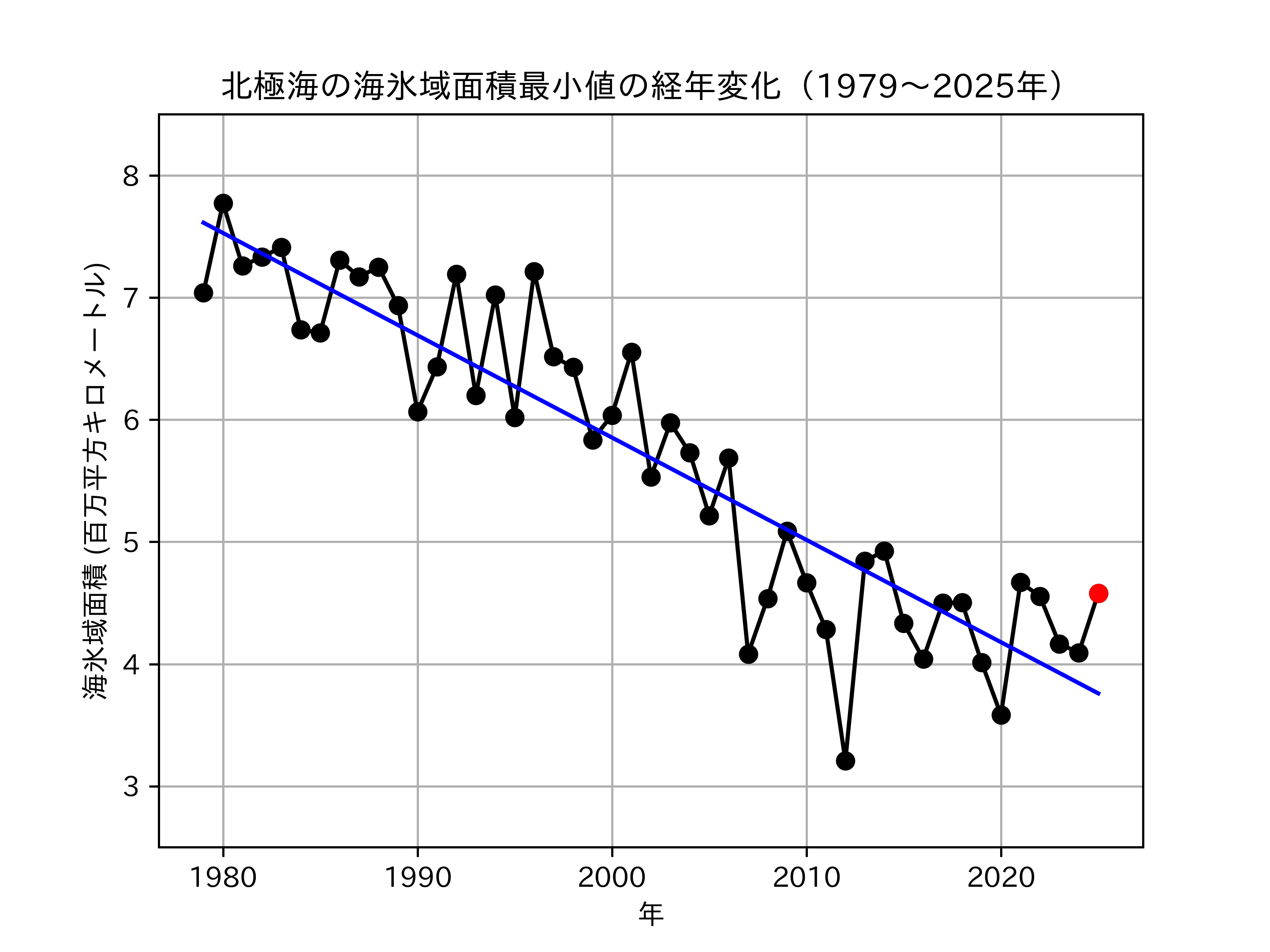 一方、長期的には北極全体での海氷面積は、1年あたり約8.4万平方キロメートル(北海道の面積に相当)のペースで減少しており、今年の海氷域面積最小値は前年よりも51万平方キロメートル大きくなったものの依然として減少傾向にあります(図4)。北極海の海氷減少は、海洋生態系や気候システムに影響を及ぼすため、今後も継続的なモニタリングと要因分析が重要です。