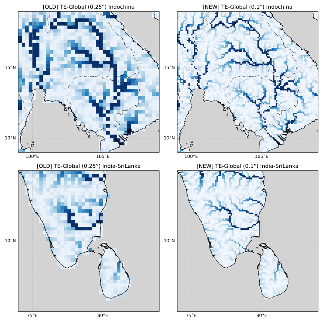 参考までに、新旧TE-Globalそれぞれの解像度で表現される河川の比較イメージを図2に示しています。旧システムでは解像度の粗さゆえに埋もれてしまっていた小さな河川や支流も、新システムではより現実に近く表現できるようになっていることがわかります。河川については、これまでの約25km格子から約10km格子へのアップデートにより、モデルが理想的に解像できる河川の数は約230程度から約1230まで増え、5倍以上となりました。