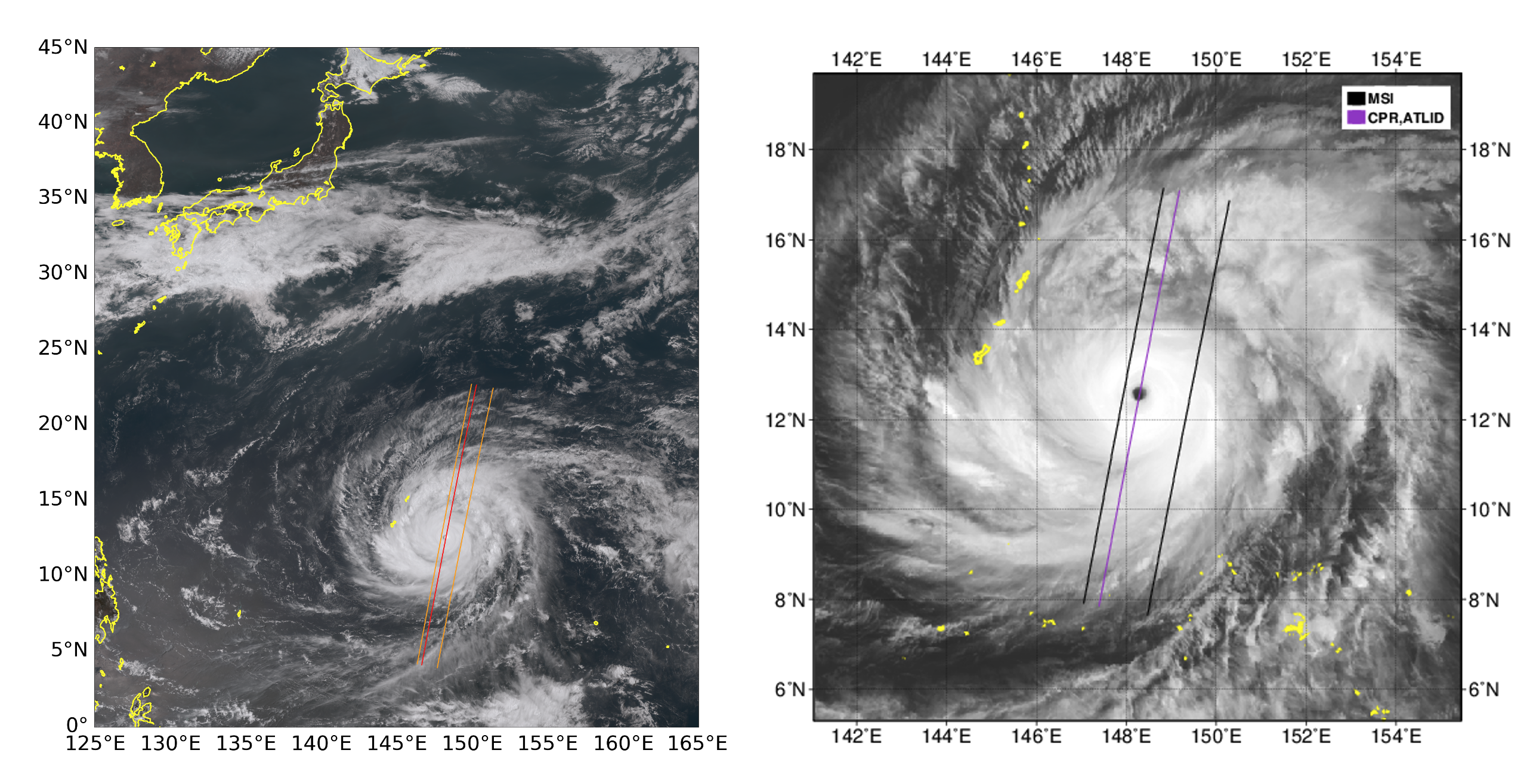 太平洋沖で発生した台風4号は4月14日の時点で、急速に発達しながらマリアナ諸島付近を北北西に進んでいました(図1左)。JAXAと欧州宇宙機関(ESA)が開発した雲エアロゾル放射ミッション「EarthCARE」衛星(和名:はくりゅう)は、この台風4号の発達した「眼」の直上を通過し、宇宙から台風雲の内部構造を詳細に観測しました。図1は静止気象衛星ひまわり9号の雲分布画像で、台風4号は日本の南東方向に位置していました。図1右に示すひまわりの赤外画像では、台風の眼がはっきりと形成されていることが確認でき、その直上(紫線)をはくりゅうが通過しています。図2は、はくりゅう搭載の多波長イメージャ(MSI)がとらえた台風4号の雲分布画像をひまわりの観測画像に重ねた図です。カラーマップはMSIから推定した雲の厚さ(雲光学的厚さ)で、台風の中心部付近の雲が非常に分厚いことがわかります。
